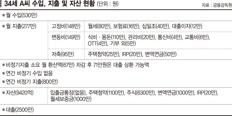 34세 A씨 월 수입은 530만원이다. 연간 비정기 수입은 없다. 월 지출은 392만원이다. 고정비가 월세(80만원), 보험료(16만원), 십일조(40만원), 대출이자(12만원) 등 148만원이다. 변동비는 식비·용돈(110만원), 관리비(20만원), 통신비(4만원), 교통비(6만원), OTT(4만원), 기부 외(5만원) 등 149만원이다. 저축은 주택청약(25만원), IRP(20만원), 변액연금(50만원) 등 95만원씩 하고 있다. 남은 138만원 중 67만원은 비정기지출로 쓴다. 연간 금액(800만원)을 월로 환산한 금액이다. 자산은 입출금통장(0원), 주택청약(1100만원), 주식(6300만원), 변액연금(1000만원), IRP(20만원), 보증금(1000만원) 등 총 9420만원이다. 대출은 2500만원이 있다.