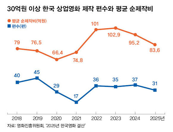 영화 제작 편수도 크게 줄었다. 흔히 ‘상업영화’로 분류하는 기준인 순제작비 30억원 이상 영화는 총 31편으로 전년(37편) 대비 6편 감소했는데, 이는 코로나19 이전인 2019년(45편)보다 30% 이상 줄어든 수치다. 코로나19 팬데믹 이후 전세계 주요 국가의 영화시장이 빠른 회복세를 보이는 것과 달리 한국 영화시장의 침체는 길어지고 있다. 김승범 나이너스엔터테인먼트 대표는 “미국은 2019년 대비 2024년 극장 박스오피스가 62% 수준, 유럽은 75%, 일본은 74%의 회복력을 보였다”며 “반면 한국은 2019년 2억3천만 명이던 관객 수가 2025년 1억600만 명으로 46%에 그쳤다. 이는 20년 전인 2005년 수치(1억2천만 명)에도 미치지 못하는 수준”이라고 설명했다.