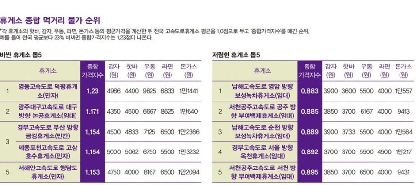 그렇다면 휴게소 중에서도 음식 가격이 유독 비싼 곳은 어디일까? 한겨레21이 전국 대부분 휴게소에서 판매하는 감자와 핫바, 우동, 라면, 돈가스 메뉴의 평균가에 견줘본 결과, 영동고속도로에 있는 덕평자연휴게소가 전국 평균가보다 약 23% 높은 가격에 음식을 팔아 가장 비싼 휴게소로 꼽혔다. 2위는 전국 평균가보다 17%가량 가격이 높은 광주대구고속도로 대구 방향 논공휴게소였고, 공동 3위는 전국 평균가보다 15.4% 가격이 높은 세종포천고속도로 고삼호수휴게소와 경부고속도로 부산 방향 금강휴게소였다. 5위는 서해안고속도로 행담도휴게소(전국 평균 대비 15.3%↑)였다. 전국 휴게소 가운데 물가가 가장 비싼 휴게소 다섯 곳 가운데 세 곳이 민자 방식으로 설립한 휴게소(덕평·행담도·고삼호수)라는 점이 눈에 띈다.