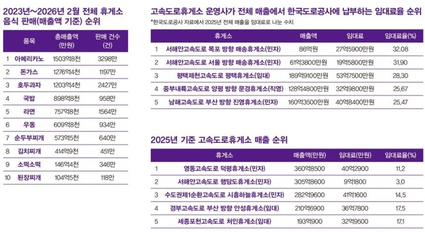 2025년 기준 주요 고속도로휴게소의 경우 매출에 견줘 임대료율이 16~23%에 달한다. 서해안고속도로 휴게소는 22.9%이고, 경부고속도로 18.7%, 중부내륙고속도로 18.4%, 영동고속도로 17.6%, 중부고속도로 16.2% 등이다. 이는 일반적인 건물보다 훨씬 높은 수준이다. 한 고속도로휴게소의 프랜차이즈에 입점한 점주 ㄹ씨는 “일반적인 건물주는 관리비를 포함해서 매출 대비 임대료를 10~12% 정도 가져간다. 휴게소는 일반 건물주보다 가져가는 임대료 비율이 더 높다”며 “여기에 3~5%가량 관리비까지 별도로 내야 한다. 결과적으로 휴게소 임대료는 일반 상권보다 1.5~2배 가까이 높게 느껴지는 것”이라고 말했다.