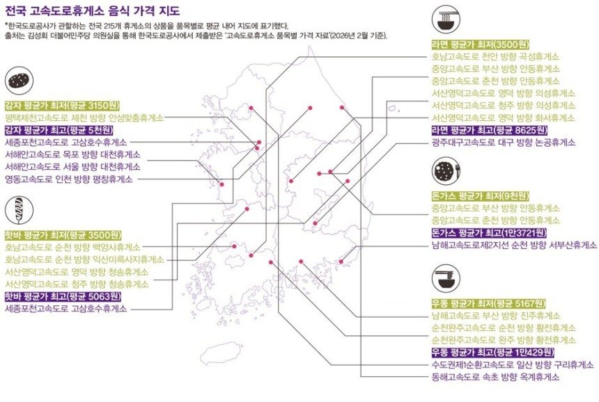 2026년 2월 기준 전국 휴게소 평균가는 감자류(회오리·통감자 포함)가 4055원, 핫바 4131원, 우동 6584원, 라면 4977원, 돈가스 1만1222원, 김밥 5547원, 비빔밥 1만74원, 김치찌개 9460원이었다. 감자와 핫바는 편의점보다 1.5배에서 2배가량 비쌌고, 수제 어묵으로 만든 프리미엄 핫바와 가격이 비슷했다. 우동과 라면, 돈가스도 시중보다 대략 20~30% 비쌌다.