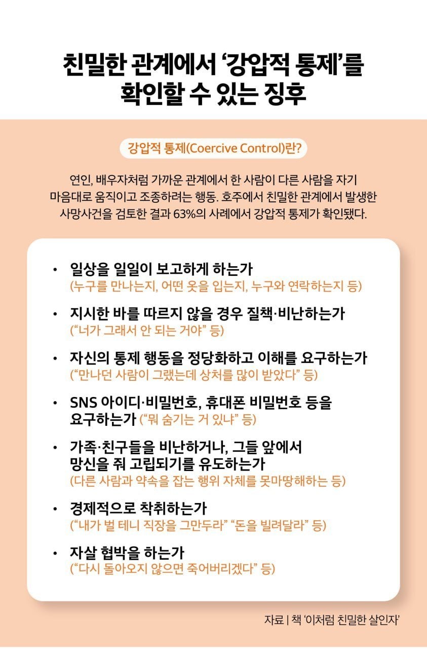 책을 통해 연인 관계에서의 ‘강압적 통제’ 위험을 강조했다.“영국은 2015년 물리적 폭력 없이 상대방을 정서적·심리적으로 조종하는 강압적 통제까지 범죄로 규정했다. 이는 교제폭력 피해자 사망 사건을 검토하면서 강압적 통제가 물리적 폭력과 살인까지 이어지는 중대 범죄라는 결론을 내렸기 때문이다.”