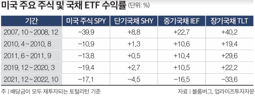 장기국채에 대한 좀 더 근본적인 오해는 단순히 이자를 받는 수익자산으로만 바라보는 데서 기인한다. 장기국채를 자산배분 포트폴리오에 담는 핵심 목적은 이자수익이 아니라, 주식투자 위험을 상쇄하는 음의 상관관계에 그 본질이 있다. 과거 미국 주식시장 주요 하락기에 국채 자산군별 수익률을 비교하면 진실은 명확해진다. 2008년 글로벌 금융위기 당시 주식이 39.9% 폭락하는 동안 장기국채 TLT는 40.2% 폭등하며 주식 손실을 완벽하게 메웠다(표 참조). 코로나19 팬데믹 때도 마찬가지였다. 유일한 예외는 인플레이션 쇼크가 덮친 2022년뿐이었다.
