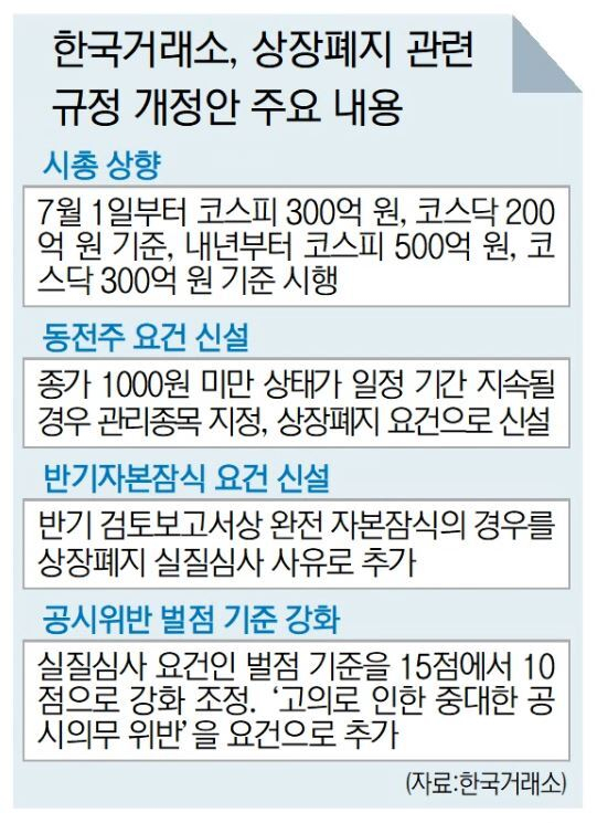 공시 위반 벌점 기준도 한층 강화한국거래소가 ‘동전주’ 퇴출 기준을 강화하는 등의 내용을 담은 상장폐지 규정 최종 개정안을 공개했다. 시가총액 기준 상향, 공시 위반 벌점 기준 강화 등 전반적인 상장 유지 요건을 높이는 가운데, 주식병합 등을 통한 동전주 퇴출 규제 회피를 전면 차단한다.