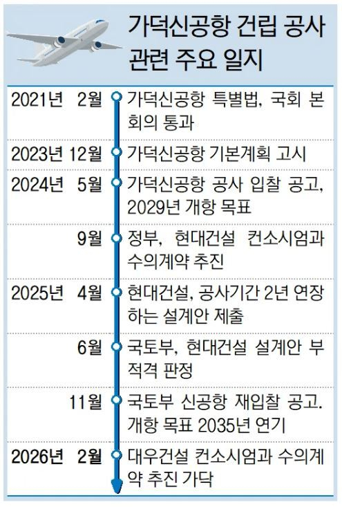 현대건설이 일방적으로 사업 불참을 통보하자 국토부 입장은 난처해졌다. 재입찰 과정 등에서 불가피하게 1~2년이 소요되는 데다 건설사들이 공기 연장을 요구하고 나서면서 당초 약속했던 2029년 개항은 지키기 어려운 분위기로 흘러갔다. 이재명 정부가 들어선 이후인 2025년 11월 국토부는 재입찰을 공고하면서 신공항의 개항 목표를 2035년으로 연기했다.
