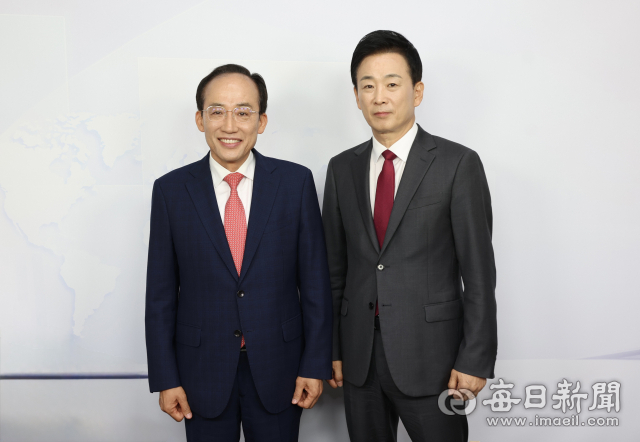 19일 대구 중구 매일신문사 스튜디오에서 열린 '제9회 전국동시지방선거 국민의힘 대구광역시장 경선 비전토론회'에서 유영하(오른쪽) 후보와 추경호 후보가 토론회 시작에 앞서 기념촬영을 하고 있다. 안성완 기자 asw0727@imaeil.com