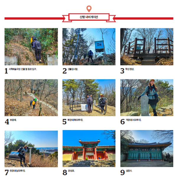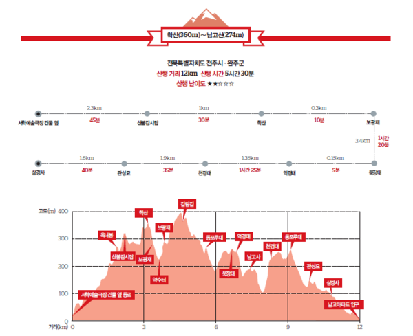 산에 들면 직진만 하면 되고, 갈림길마다 번호표를 단 이정표가 친절하게 서 있다. 마을과 가까워 운동기구들도 많이 보이고, 낮은 산이라 어렵지 않다. 학산을 잠시 다녀와 보광재 방향으로 이동, 남고산성 방향 북쪽으로 진행. 시간이 넉넉하다면 남고산성을 쉬엄쉬엄 한 바퀴 돌아보며 인근 산 조망이며 전주시가지를 보는 게 좋다. 산행 후 인근 한옥마을이 가까우니 경기전, 향교, 이목대, 오목대, 풍남문 등과 맛집 주전부리 탐방도 함께해 보면 좋겠다.