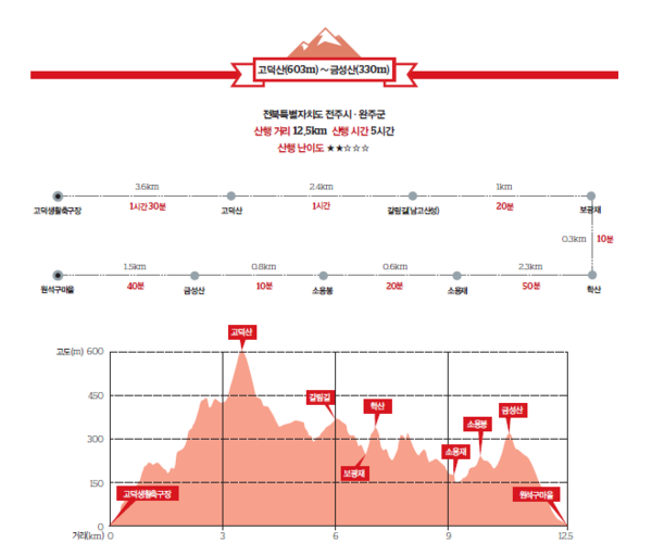 교통 전주는 호남선 KTX, ITX, 무궁화 등 열차 이용이 편하고, 고속버스 시외버스 터미널로도 진입이 편하다. 전주 지역이 넓지 않기 때문에 전주 내에선 택시 이용이 편리하다. 원석구마을과 고덕생활축구장은 약 17km, 택시로는 1만5,000원 내외, 20분 안쪽으로 간다. 버스 이용 시 201, 203번을 타면 한 번에 편하게 이동할 수 있다. 시간은 1시간 정도 잡아야 한다. 들머리 날머리 자차 이동시 고덕생활축구장(전주시 완산구 색장동 872- 33) 주차장에 무료 주차 가능하다, 원석구마을회관(전주시 완산구 석구길 13) 앞에 주차가 가능하다.