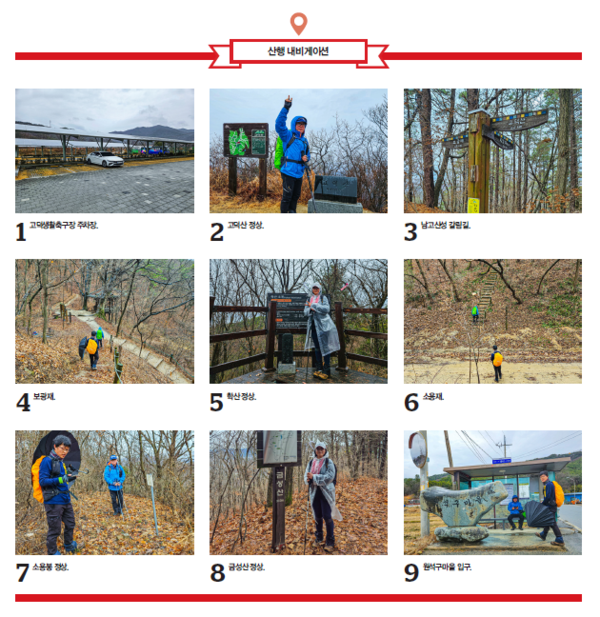 산행길잡이 산행 시작은 고덕생활축구장과 원석구마을 어디라도 좋다. 원석구마을보다는 주차장이 제대로 갖춰진 고덕생활축구장에 주차가 편하니 들머리로 선호된다. 원석구마을 주차는 길가나 회관 앞에 해야 한다. 이정표가 잘되어 있고 사람들이 많이 다녀서 길 잃을 걱정은 하지 않아도 된다. 고덕산에서 학산 방향으로 갈 때 남고산 쪽 우회길, 왼쪽 봉우리로 올라 보광재로 가는 길, 두 곳은 이정표가 없으니 주의해야 한다. 소용재에서 오르막을 올라 금성산 갈림길에서 직진으로 조금만 오르면 소용봉에 다녀올 수 있다. 금성산 갈림길로 다시 내려와 원석구마을로 하산 시 일부 구간은 묘지들로 길 찾기가 조금 어려울 수 있다. 오른쪽 원석구마을 방향으로 내려간다고 생각하고 이동하면 큰 문제는 없다.