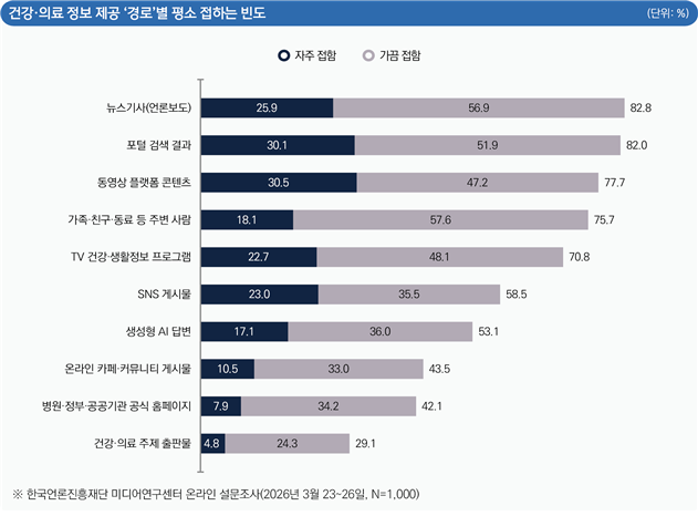 한국언론진흥재단이 15일 발표한 ‘디지털·AI 플랫폼을 통한 건강·의료 정보 소비 및 인식’ 조사 결과에 따르면, 응답자들의 82.8%는 ‘뉴스기사(언론보도)’를 통해 건강·의료 정보를 가장 많이 접하고 있다고 답했다. 그 뒤를 ‘포털 검색 결과(82.0%)’, ‘동영상 플랫폼 콘텐츠(77.7%)’, ‘가족·친구·동료 등 주변 사람(75.7%)’ 등이 이었고, 비교적 최근에 서비스되기 시작한 ‘생성형 인공지능(AI) 답변’은 절반이 조금 넘는 53.1%가 경험한 적이 있다고 답했다.
