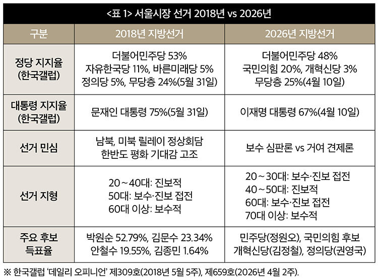 8년이 지난 2026년엔 세대별 선거 지형이 많이 달라졌다. 20∼30대와 60대는 보수와 진보가 균형을 이루는 세대로 바뀌었고, 40∼50대는 진보로, 70대는 보수로 구분해 볼 수 있다. 그때와 달리 2026년은 보수 분열은 아직 일어나지 않고 있다. 개혁신당은 3% 안팎의 지지율 한계를 돌파하지 못하고 있고, 김문수 전 경기지사, 유승민 전 의원, 한동훈 전 국민의힘 대표 등은 보수 신당 창당과 같은 세력화에 선을 긋고 있다.