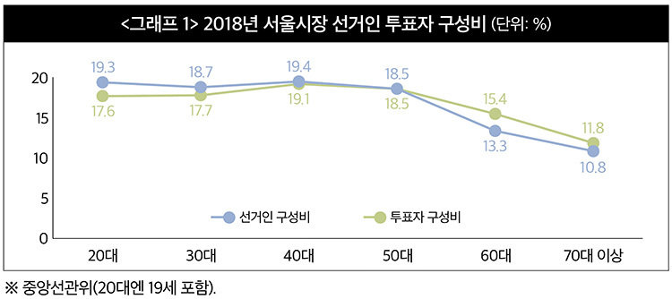 그해 서울시장 선거의 20∼40대 선거인 비중은 57.4%인데 투표자 비중은 54.4%였다. 20∼40대가 투표에 대거 참여하면 선거인과 투표자 비중의 차이가 거의 없었던 셈이다. 60대 이상 선거인은 24.1%인데 투표자 비중은 27.2%로 3.1%포인트만 늘어났다. 50대 선거인과 투표자 비중은 각각 18.5%로 같았다. 당시 선거 지형도 민주당에 유리했다. 20∼40대는 진보성향으로 볼 수 있다. 즉 20∼40대의 투표자 비중 54.4%에선 민주당 득표율이 높았다고 추정할 수 있다. 50대는 보수와 진보가 균형을 이루는 세대로 투표자 비중은 18.5%였다. 50대에선 민주당과 보수 야당(한국당+바른미래당)의 득표율이 비슷했다고 추정할 수 있다. 60대 이상은 보수 야당이 유리한 세대로 투표자 비중은 27.2%에 그쳤다. 2018년 서울시장 선거는 ‘20∼40대 vs 60대 이상’ 구도였던 셈이다(<그래프 1> 참조).