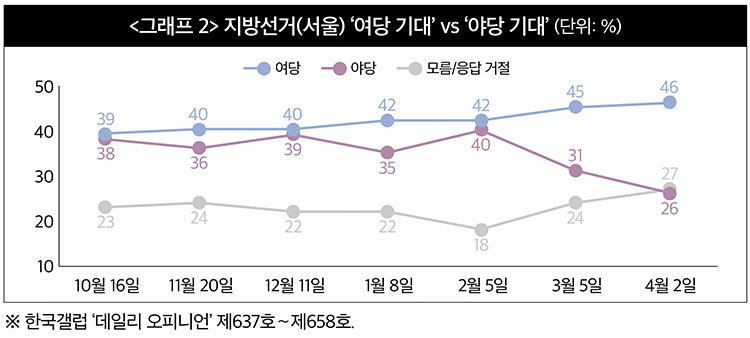 국민의힘의 서울시장 선거 전망이 갑자기 어두워지기 시작한 것은 3월 5일 한국갤럽 여론조사에서였다. 이보다 한 달여 전인 1월 말 국민의힘은 한 전 대표의 제명을 확정했다. 이것이 바로 국민의힘의 지지율을 끌어내린 간접적 원인이 됐다. 한 전 대표가 2월 말 대구를 방문하자 국민의힘은 3월 3일 동행한 친한동훈계 의원, 당협위원장 8명을 중앙당 윤리위원회에 제소했다. 4월 2일 여론조사에선 국민의힘 지지율은 떨어지고 지방선거 전망은 더욱 나빠졌다. 국민의힘 공천관리위원회가 3월 22일 이진숙 전 방통위원장과 주호영 의원을 대구시장 후보군에서 배제(‘컷오프’)했다. 3월 29일엔 김부겸 전 총리가 대구 출마를 공식화했다. 3월 31일 법원은 김영환 충북지사의 가처분신청을 인용했다. 이처럼 국민의힘 내분이 확산하면서 서울시장 선거 전망도 급속히 악화한 것이다.