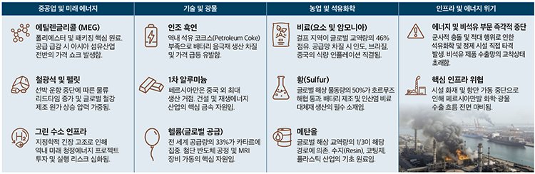 전 세계 요소(urea) 거래량의 절반은 중동에서 나오는데, 카타르 한 국가가 전 세계 시장의 10%를 차지한다. 비료 가격이 오르면 곡물 수확량이 줄고, 이는 빵값, 고깃값 상승으로 이어지는 ‘애그플레이션’을 유발한다. 현재 인도는 비료 재고가 수요의 3분의 1 수준으로 떨어져 심각한 식량 위기에 직면해 있다.