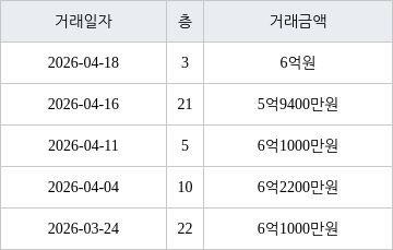 [이 기사는 조선비즈와 아티웰스가 공동으로 개발해 서비스하는 로봇 기사입니다.] 국토교통부 실거래가 공개시스템에 따르면 지난 2026년 4월 18일 인천광역시 서구 원당동 검단신도시 예미지 트리플에듀 아파트 3층 전용면적 84㎡형이 6억원에 거래됐다.